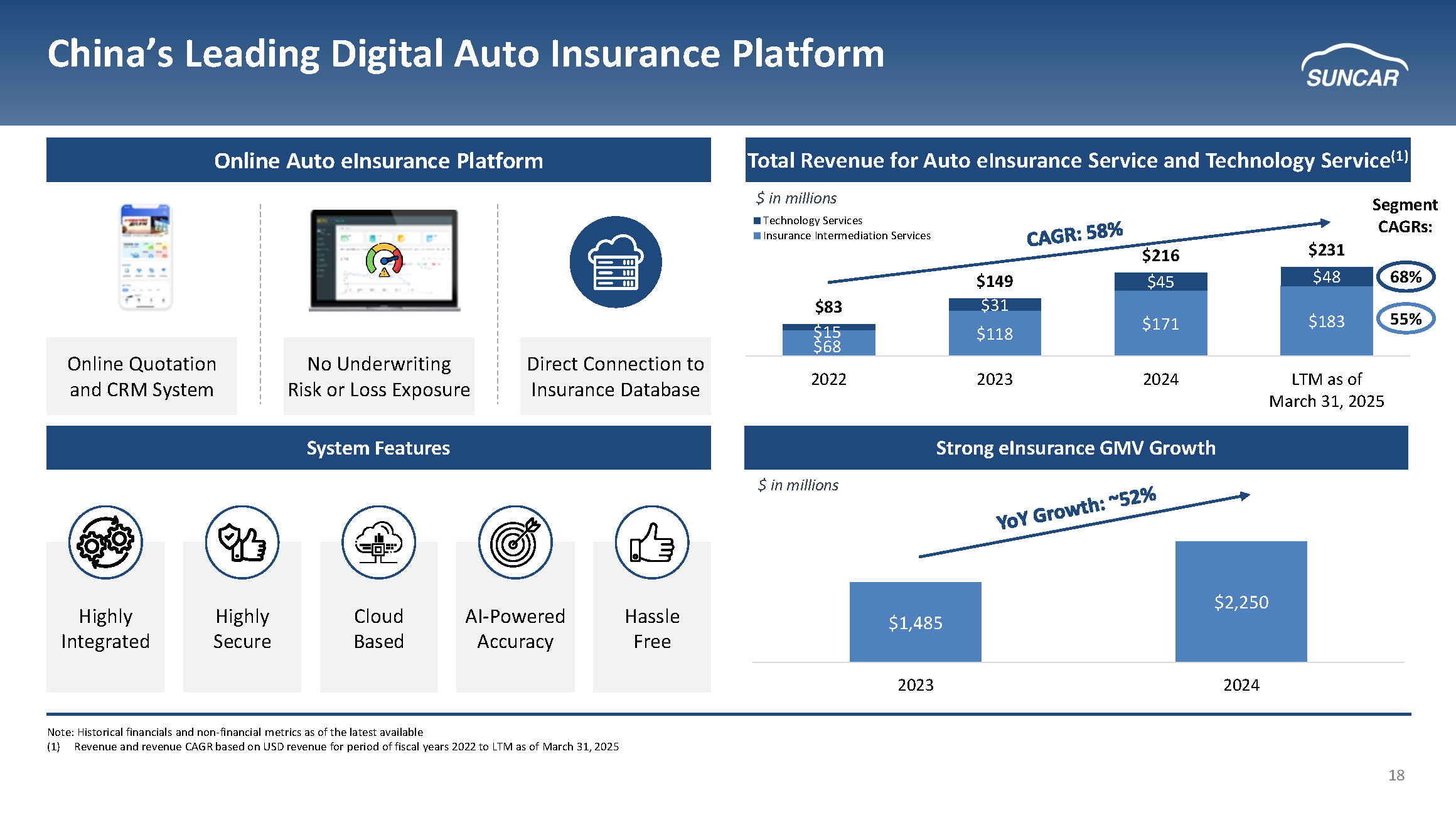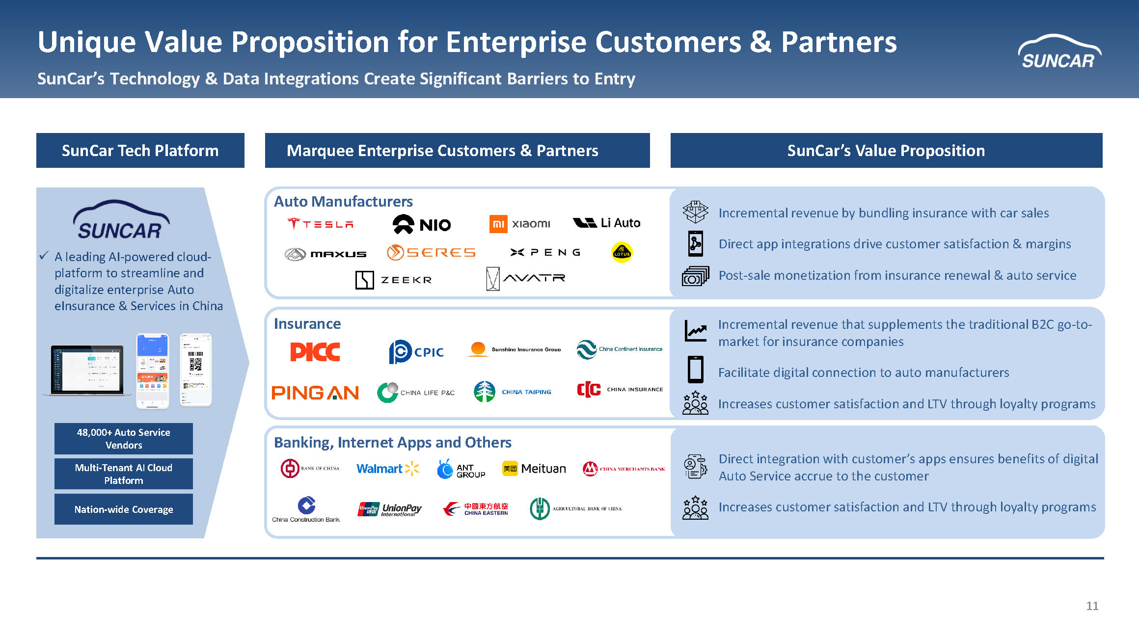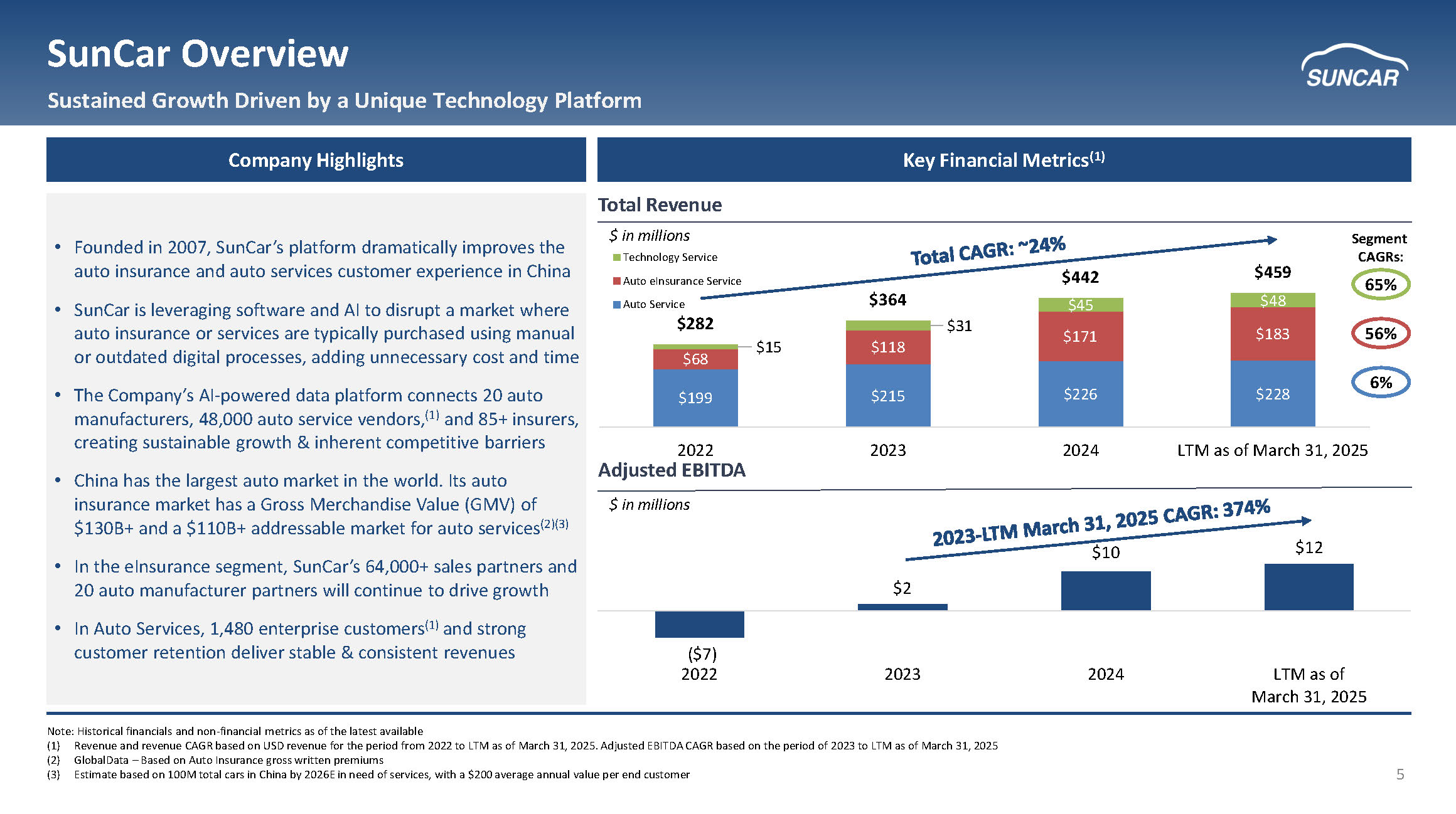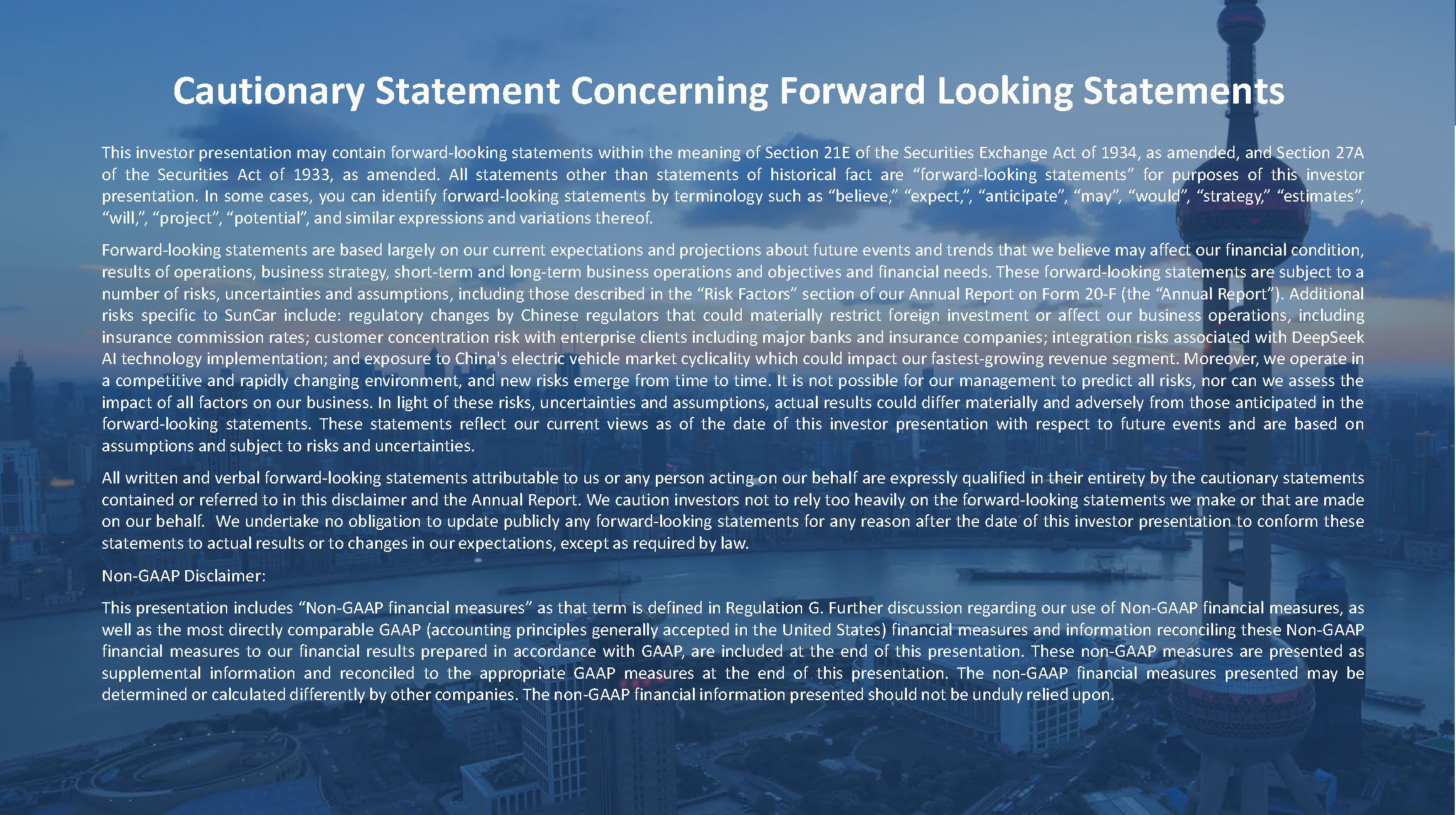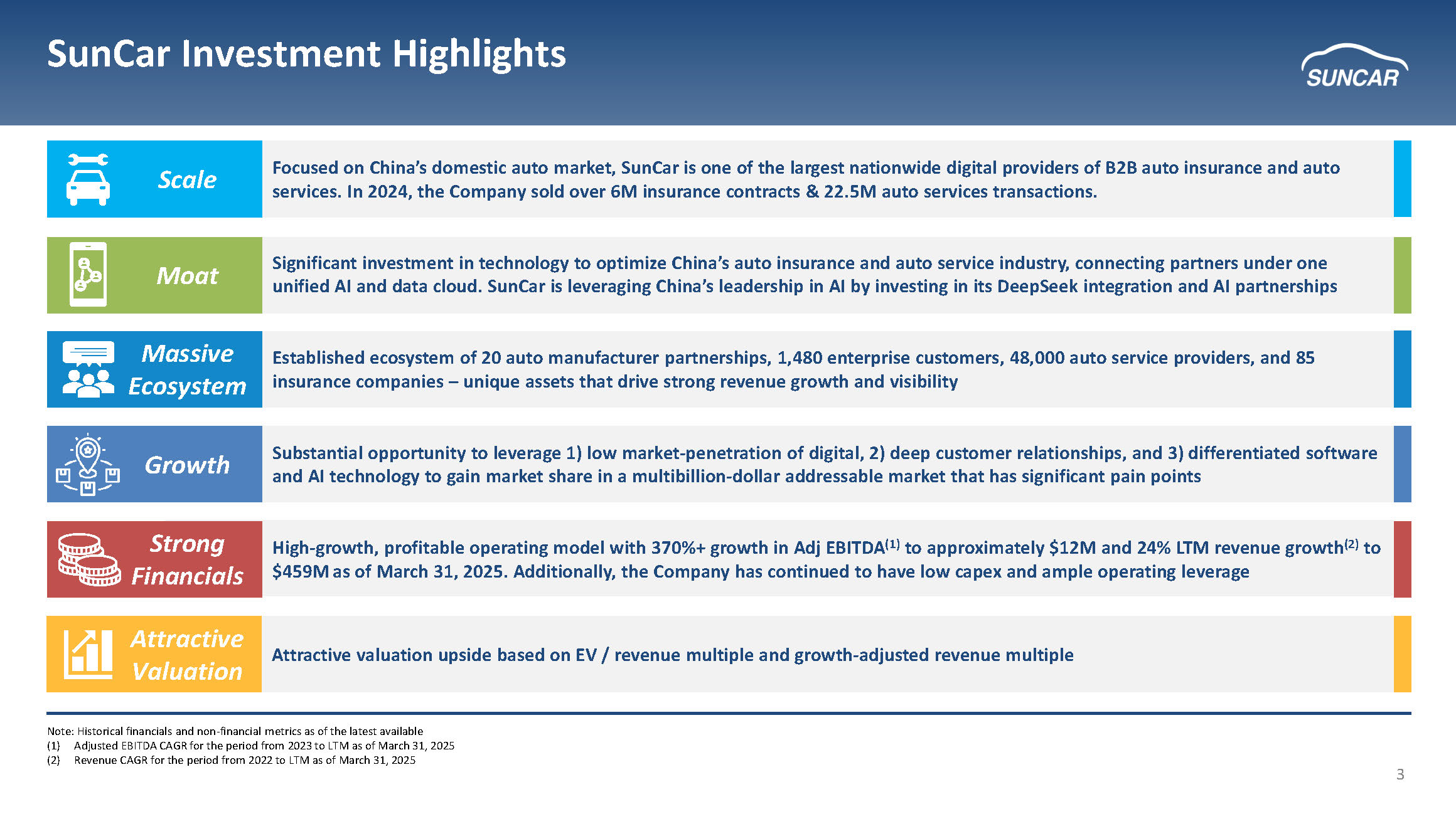 2 This investor presentation may contain forward - looking statements within the meaning of Section 21 E of the Securities Exchange Act of 1934 , as amended, and Section 27 A of the Securities Act of 1933 , as amended . All statements other than statements of historical fact are “forward - looking statements” for purposes of this investor presentation . In some cases, you can identify forward - looking statements by terminology such as “believe,” “expect,”, “anticipate”, “may”, “would”, “strategy,” “estimates”, “will,”, “project”, “potential”, and similar expressions and variations thereof . Forward - looking statements are based largely on our current expectations and projections about future events and trends that we believe may affect our financial condition, results of operations, business strategy, short - term and long - term business operations and objectives and financial needs . These forward - looking statements are subject to a number of risks, uncertainties and assumptions, including those described in the “Risk Factors” section of our Annual Report on Form 20 - F (the “Annual Report”) . Additional risks specific to SunCar include : regulatory changes by Chinese regulators that could materially restrict foreign investment or affect our business operations, including insurance commission rates ; customer concentration risk with enterprise clients including major banks and insurance companies ; integration risks associated with DeepSeek AI technology implementation ; and exposure to China's electric vehicle market cyclicality which could impact our fastest - growing revenue segment . Moreover, we operate in a competitive and rapidly changing environment, and new risks emerge from time to time . It is not possible for our management to predict all risks, nor can we assess the impact of all factors on our business . In light of these risks, uncertainties and assumptions, actual results could differ materially and adversely from those anticipated in the forward - looking statements . These statements reflect our current views as of the date of this investor presentation with respect to future events and are based on assumptions and subject to risks and uncertainties . All written and verbal forward - looking statements attributable to us or any person acting on our behalf are expressly qualified in their entirety by the cautionary statements contained or referred to in this disclaimer and the Annual Report . We caution investors not to rely too heavily on the forward - looking statements we make or that are made on our behalf . We undertake no obligation to update publicly any forward - looking statements for any reason after the date of this investor presentation to conform these statements to actual results or to changes in our expectations, except as required by law . Non - GAAP Disclaimer : This presentation includes “Non - GAAP financial measures” as that term is defined in Regulation G . Further discussion regarding our use of Non - GAAP financial measures, as well as the most directly comparable GAAP (accounting principles generally accepted in the United States) financial measures and information reconciling these Non - GAAP financial measures to our financial results prepared in accordance with GAAP, are included at the end of this presentation . These non - GAAP measures are presented as supplemental information and reconciled to the appropriate GAAP measures at the end of this presentation . The non - GAAP financial measures presented may be determined or calculated differently by other companies . The non - GAAP financial information presented should not be unduly relied upon . Cautionary Statement Concerning Forward Looking Statements