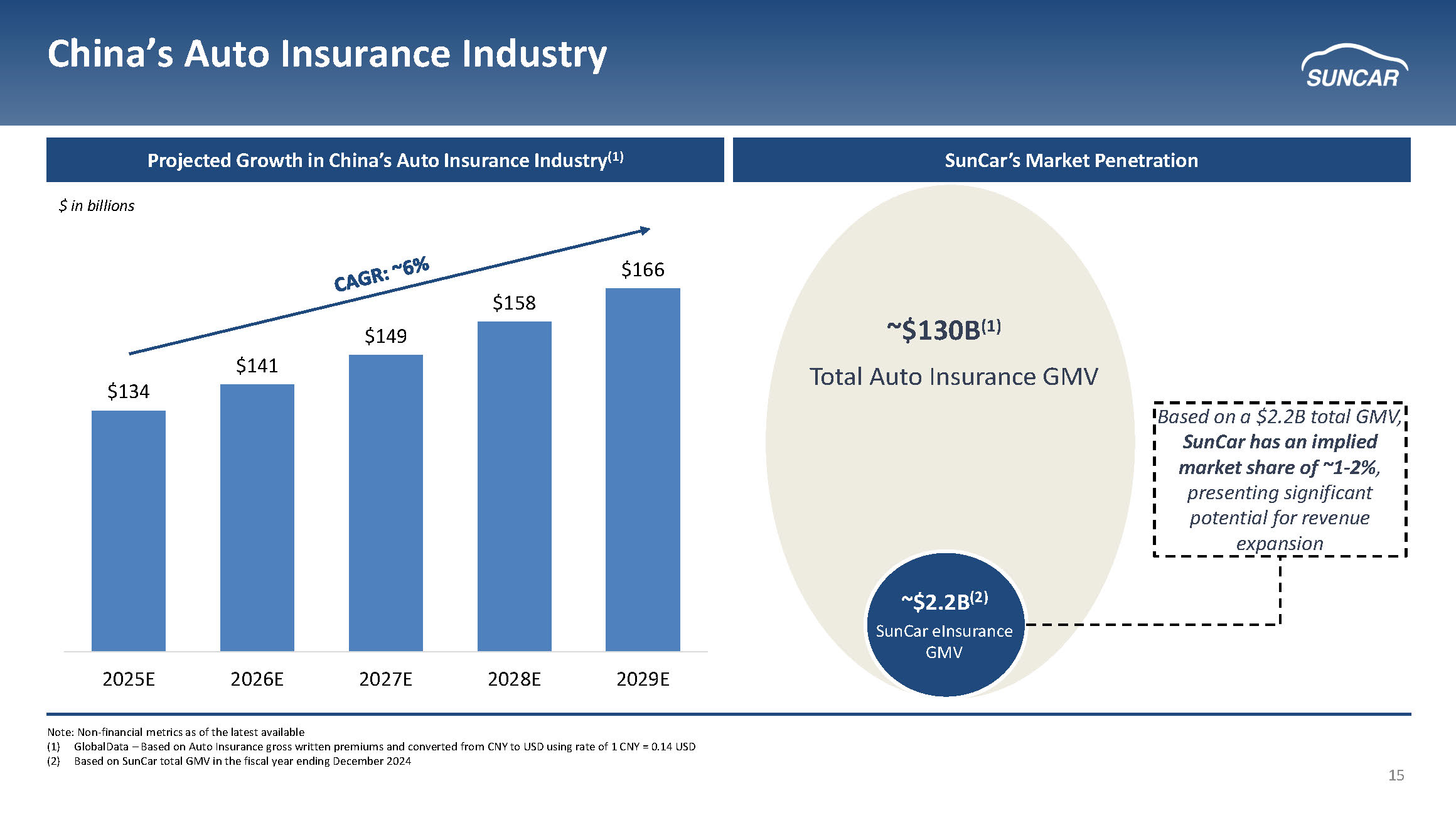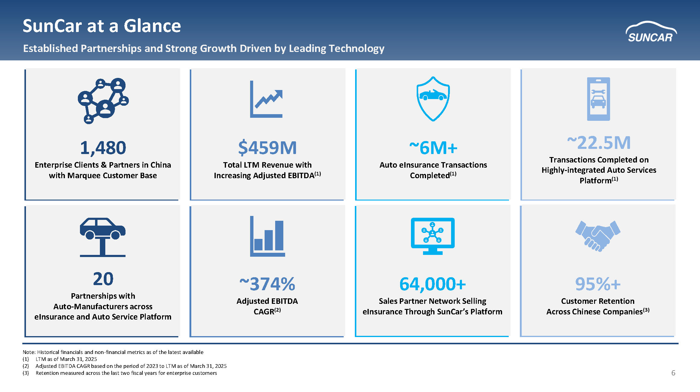 5 SunCar Overview Sustained Growth Driven by a Unique Technology Platform Company Highlights Key Financial Metrics (1) Adjusted EBITDA Total Revenue • Founded in 2007, SunCar ’s platform dramatically improves the auto insurance and auto services customer experience in China • SunCar is leveraging software and AI to disrupt a market where auto insurance or services are typically purchased using manual or outdated digital processes, adding unnecessary cost and time • The Company’s AI - powered data platform connects 20 auto manufacturers, 48,000 auto service vendors, (1) and 85+ insurers, creating sustainable growth & inherent competitive barriers • China has the largest auto market in the world. Its auto insurance market has a Gross Merchandise Value (GMV) of $130B+ and a $110B+ addressable market for auto s ervices (2)(3) • In the eInsurance segment, SunCar’s 64,000+ sales partners and 20 auto manufacturer partners will continue to drive growth • In Auto Services, 1,480 enterprise customers (1) and strong customer retention de liver stable & consistent revenues $ in millions $ in millions Note: Historical financials and non - financial metrics as of the latest available (1) Revenue and revenue CAGR based on USD revenue for the period from 2022 to LTM as of March 31, 2025. Adjusted EBITDA CAGR base d o n the period of 2023 to LTM as of March 31, 2025 (2) GlobalData – Based on Auto Insurance gross written premiums (3) Estimate based on 100M total cars in China by 2026E in need of services, with a $200 average annual value per end customer ($7) $2 $10 $12 2022 2023 2024 LTM as of March 31, 2025 $199 $215 $226 $228 $68 $118 $171 $183 $15 $31 $45 $48 $282 $364 $442 $459 2022 2023 2024 LTM as of March 31, 2025 Technology Service Auto eInsurance Service Auto Service Segment CAGRs: 65% 56% 6%
