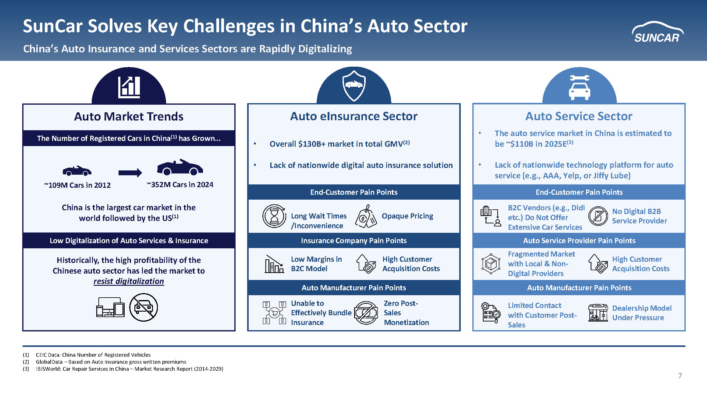 6 SunCar at a Glance Established Partnerships and Strong Growth Driven by Leading Technology 1,48 0 Enterprise Clients & Partners in China with Marquee Customer Base $459M Total LTM Revenue with Increasing Adjusted EBITDA (1) ~6M+ Auto e Insurance Transactions Completed (1 ) ▪ 4 95%+ Customer Retention Across Chinese Companies (3) 64,000+ Sales Partner Network Selling eInsurance Through SunCar’s Platform ~ 22.5 M Transactions Completed on Highly - integrated Auto Services Platform ( 1 ) 20 Partnerships with Auto - Manufacturers across eInsurance and Auto Service Platform Note: Historical financials and non - financial metrics as of the latest available (1) LTM as of March 31, 2025 (2) Adjusted EBITDA CAGR based on the period of 2023 to LTM as of March 31, 2025 (3) Retention measured across the last two fiscal years for enterprise customers ~374% Adjusted EBITDA CAGR (2)
