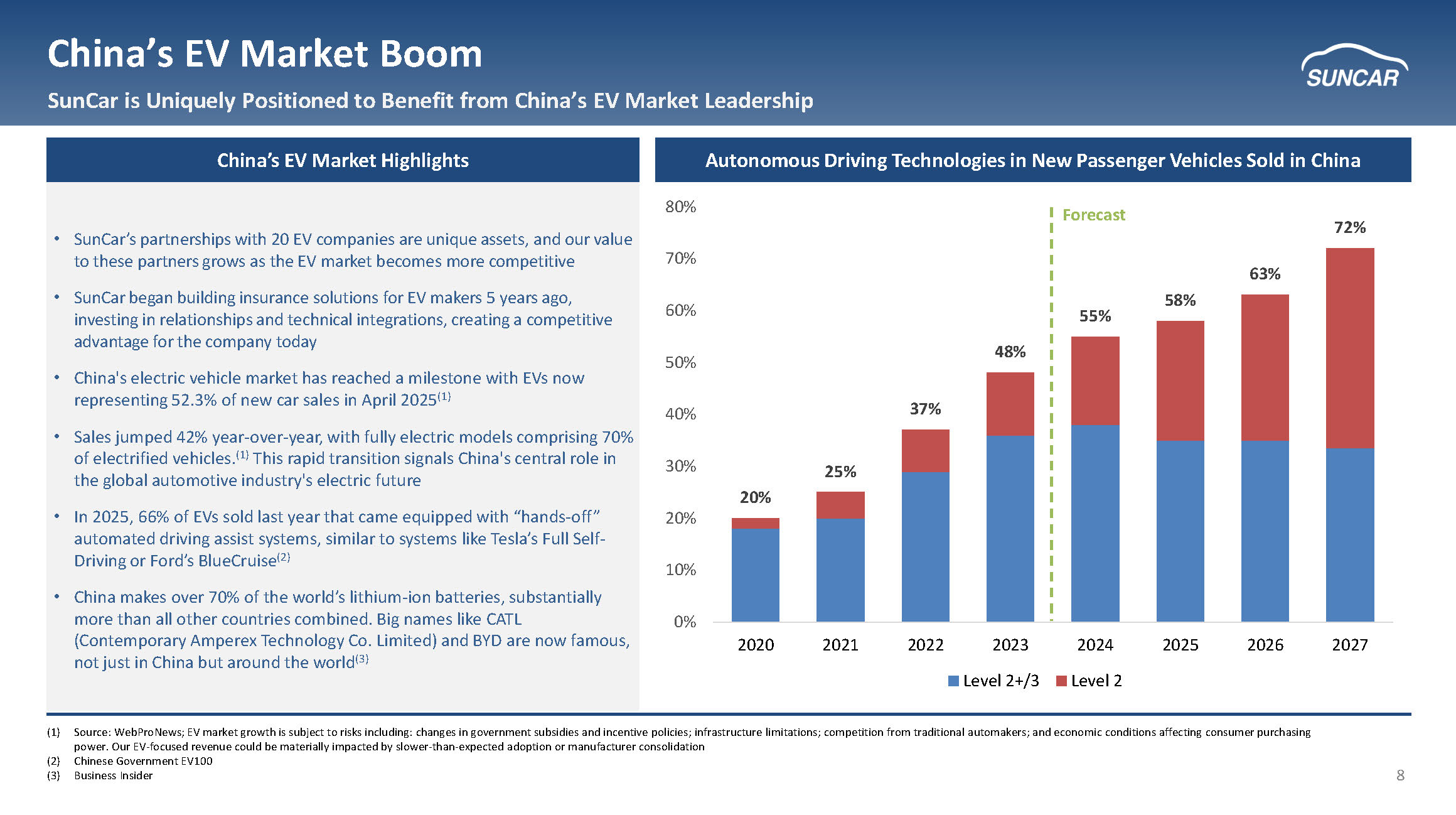 7 SunCar Solves Key Challenges in China’s Auto Sector China’s Auto Insurance and Services Sectors are Rapidly Digitalizing Auto Service Provider Pain Points End - Customer Pain Points Auto Manufacturer Pain Points Limited Contact with Customer Post - Sales Fragmented Market with Local & Non - Digital Providers High Customer Acquisition Costs B2C Vendors (e.g., Didi etc.) Do Not Offer Extensive Car Services No Digital B2B Service Provider Auto Service Sector Auto Manufacturer Pain Points Auto eInsurance Sector Low Margins in B2C Model High Customer Acquisition Costs Unable to Effectively Bundle Insurance End - Customer Pain Points Insurance Company Pain Points Long Wait Times /Inconvenience Opaque Pricing Auto Market Trends Historically, the high profitability of the Chinese auto sector has led the market to resist digitalization The Number of Registered Cars in China (1) has Grown… ~109M Cars in 2012 ~352M Cars in 2024 China is the largest car market in the world followed by the US (1) Low Digitalization of Auto Services & Insurance • Overall $130B+ market in total GMV (2) • Lack of nationwide digital auto insurance solution • The auto service market in China is estimated to be ~$110B in 2025E (3) • Lack of nationwide technology platform for auto service (e.g., AAA, Yelp, or Jiffy Lube) Zero Post - Sales Monetization Dealership Model Under Pressure (1) CEIC Data: China Number of Registered Vehicles (2) GlobalData – Based on Auto Insurance gross written premiums (3) IBISWorld: Car Repair Services in China – Market Research Report (2014 - 2029)