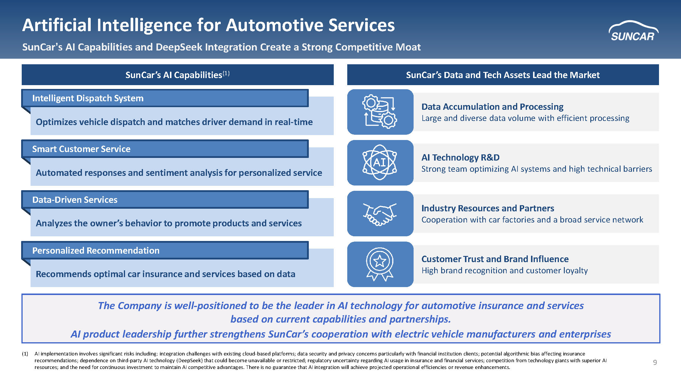 9 SunCar’s AI Capabilities (1) SunCar’s Data and Tech Assets Lead the Market Artificial Intelligence for Automotive Services SunCar's AI Capabilities and DeepSeek Integration Crea te a Strong Competitive Moat The Company is well - positioned to be the leader in AI technology for automotive insurance and services based on current capabilities and partnerships. AI product leadership further strengthens SunCar’s cooperation with electric vehicle manufacturers and enterprises Optimizes vehicle dispatch and matches driver demand in real - time Intelligent Dispatch System Data Accumulation and Processing Large and diverse data volume with efficient processing Automated responses and sentiment analysis for personalized service Smart Customer Service Analyzes the owner’s behavior to promote products and services Data - Driven Services Recommends optimal car insurance and services based on data Personalized Recommendation AI Technology R&D Strong team optimizing AI systems and high technical barriers Industry Resources and Partners Cooperation with car factories and a broad service network Customer Trust and Brand Influence High brand recognition and customer loyalty (1) AI implementation involves significant risks including: integration challenges with existing cloud - based platforms; data securit y and privacy concerns particularly with financial institution clients; potential algorithmic bias affecting insurance recommendations; dependence on third - party AI technology (DeepSeek) that could become unavailable or restricted; regulatory unce rtainty regarding AI usage in insurance and financial services; competition from technology giants with superior AI resources; and the need for continuous investment to maintain AI competitive advantages. There is no guarantee that AI integr ati on will achieve projected operational efficiencies or revenue enhancements.