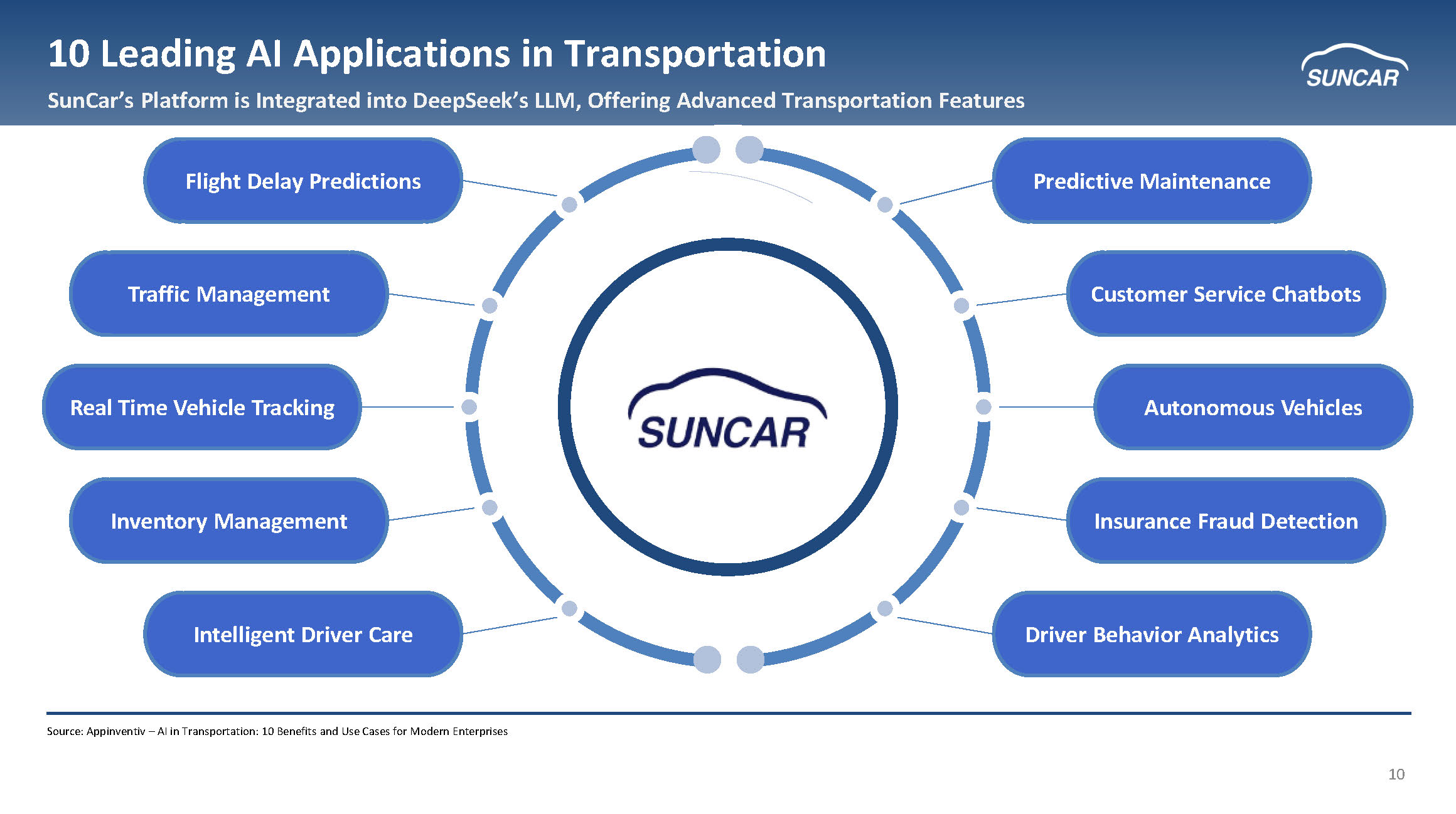 10 10 Leading AI Applications in Transportation SunCar’s Platform is Integrated into DeepSeek’s LLM, Offering Advanced Transportation Features Autonomous Vehicles Customer Service Chatbots Predictive Maintenance Insurance Fraud Detection Driver Behavior Analytics Intelligent Driver Care Inventory Management Real Time Vehicle Tracking Traffic Management Flight Delay Predictions Source: Appinventiv – AI in Transportation: 10 Benefits and Use Cases for Modern Enterprises