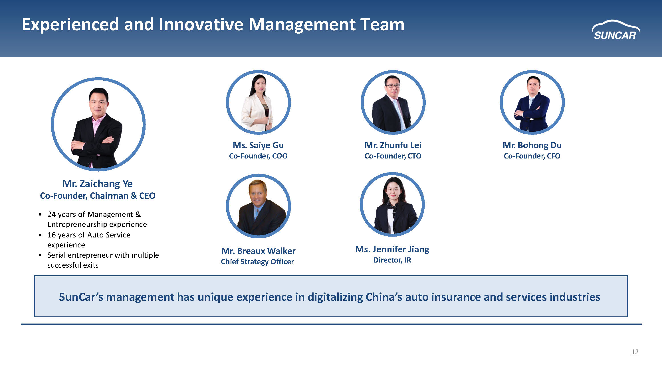 12 M r . Zaichang Ye Co - Founder, Chairman & CEO • 24 years of Management & Entrepreneurship experience • 16 years of Auto Service experience • Serial entrepreneur with multiple successful exits SunCar’s management has unique experience in digitalizing China’s auto insurance and services industries M r . Zhunfu Lei Co - Founder, CTO M s . Saiye Gu Co - Founder, COO M r . Bohong Du Co - Founder, CFO Experienced and Innovative Management Team Ms. Jennifer Jiang Director, IR Mr. Breaux Walker Chief Strategy Officer