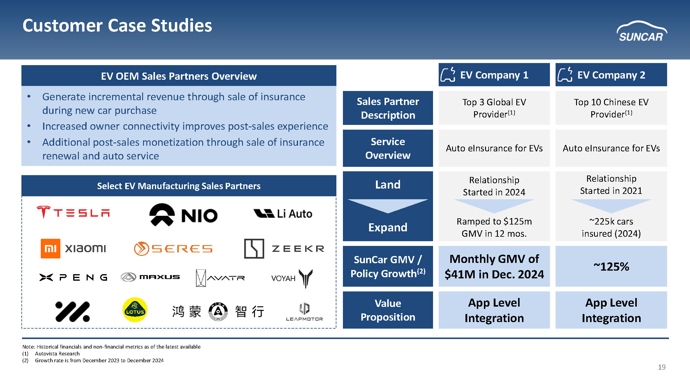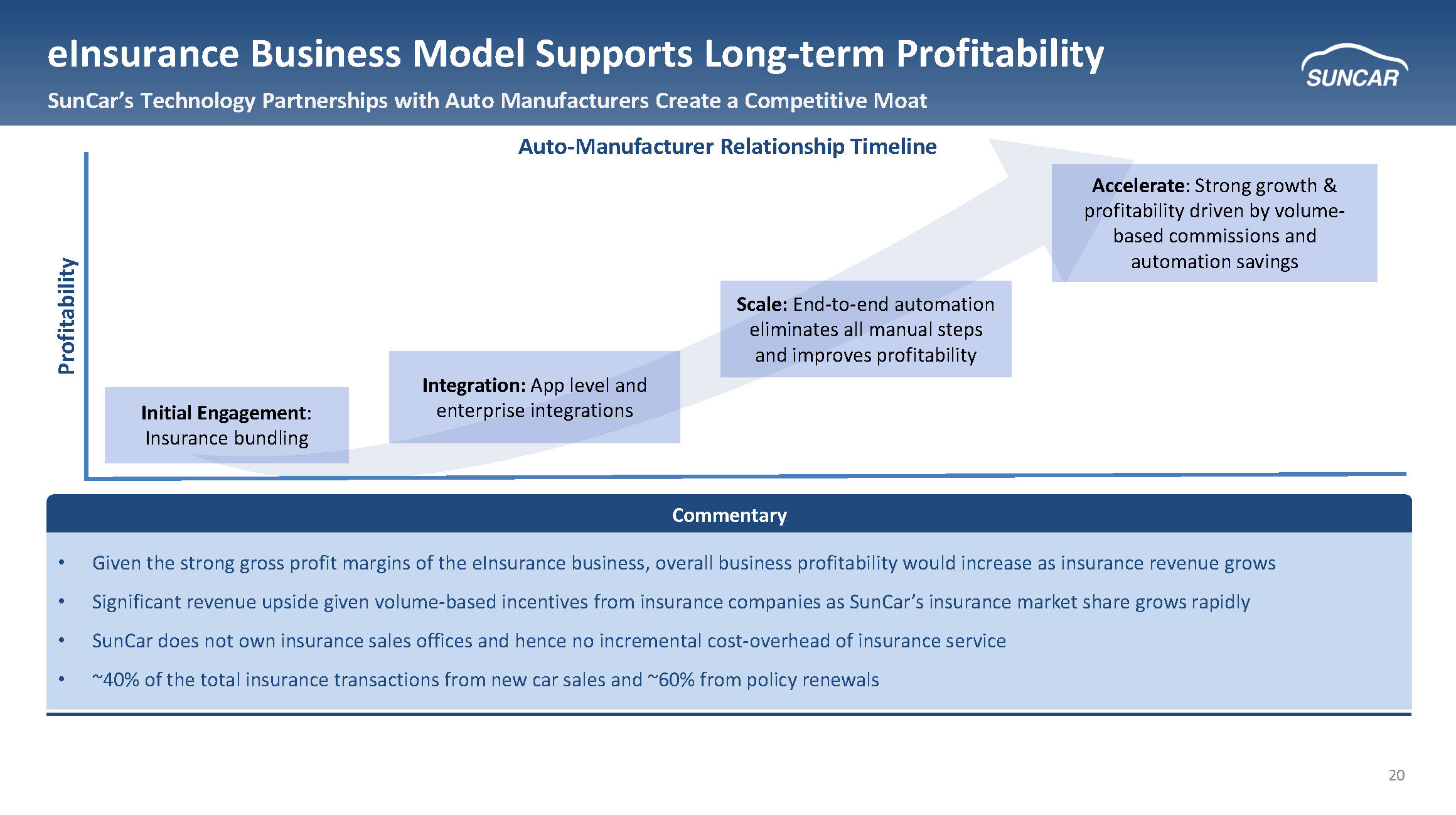 19 Customer Case Studies Note: Historical financials and non - financial metrics as of the latest available (1) Autovista Research (2) Growth rate is from December 2023 to December 2024 f EV OEM Sales Partners Overview • Generate incremental revenue through sale of insurance during new car purchase • Increased owner connectivity improves post - sales experience • Additional post - sales monetization through sale of insurance renewal and auto service Top 10 Chinese EV Provider (1) Top 3 Global EV Provider (1) Sales Partner Description Auto eInsurance for EVs Auto eInsurance for EVs Service Overview ~125% Monthly GMV of $41M in Dec. 2024 SunCar GMV / Policy Growth (2) Relationship Started in 2021 ~225k cars insured (2024) Relationship Started in 2024 Ramped to $125m GMV in 12 mos. Land Expand EV Company 1 EV Company 2 Select EV Manufacturing Sales Partners Value Proposition App Level Integration App Level Integration