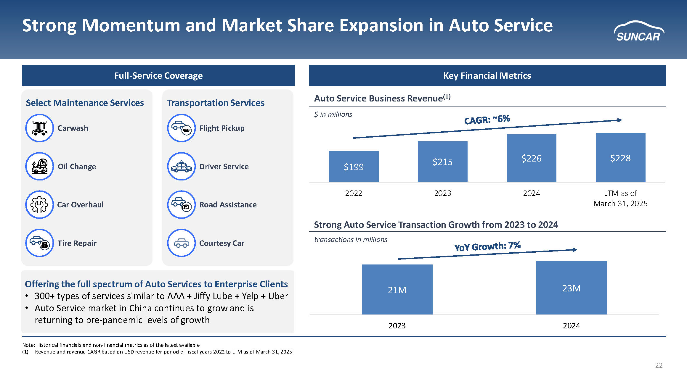 22 $199 $215 $226 $228 2022 2023 2024 LTM as of March 31, 2025 Strong Momentum and Market Share Expansion in Auto Service Full - Service Coverage Key Financial Metrics Offering the full spectrum of Auto Services to Enterprise Clients • 300+ types of services similar to AAA + Jiffy Lube + Yelp + Uber • Auto Service market in China continues to grow and is returning to pre - pandemic levels of growth Select Maintenance Services Transportation Services Carwash Flight Pickup Oil Change Driver Service Courtesy Car Road Assistance Tire Repair Car Overhaul Strong Auto Service Transaction Growth from 2023 to 2024 Auto Service Business Revenue (1) Note: Historical financials and non - financial metrics as of the latest available (1) Revenue and revenue CAGR based on USD revenue for period of fiscal years 2022 to LTM as of March 31, 2025 $ in millions 21 M 23 M 2023 2024 transactions in millions