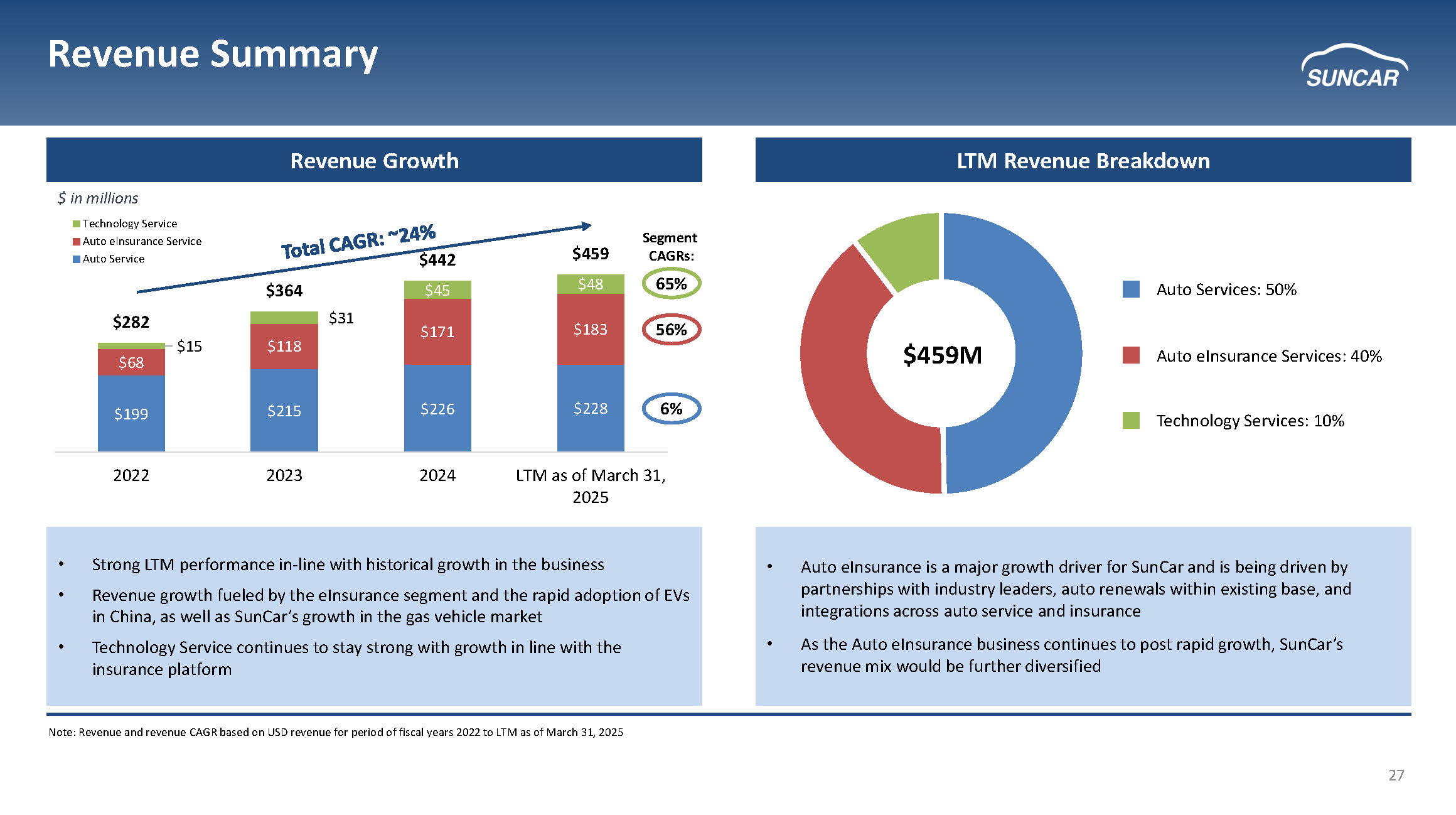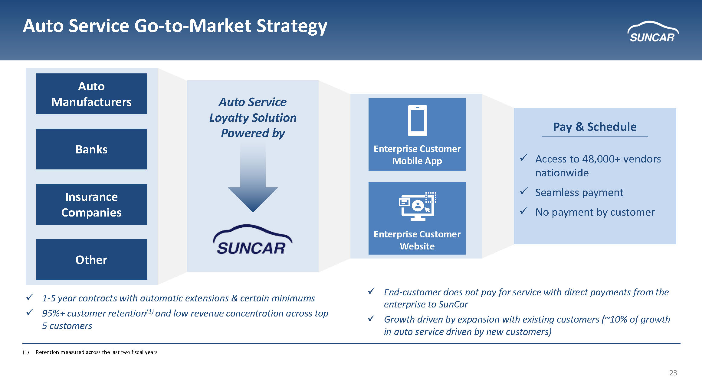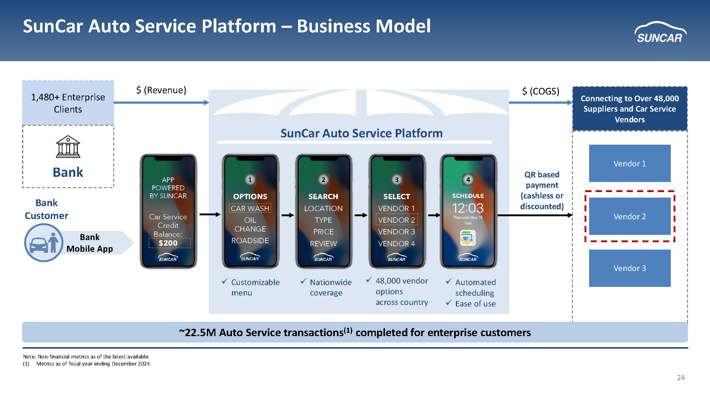 23 Auto Service Go - to - Market Strategy x 1 - 5 year contracts with automatic extensions & certain minimums x 95%+ customer retention (1) and low revenue concentration across top 5 customers x End - customer does not pay for service with direct payments from the enterprise to SunCar x Growth driven by expansion with existing customers (~10% of growth in auto service driven by new customers) Auto Manufacturers Banks Insurance Companies Other Pay & Schedule x Access to 48,000+ vendors nationwide x Seamless payment x No payment by customer Enterprise Customer Mobile App Enterprise Customer Website Auto Service Loyalty Solution Powered by (1) Retention measured across the last two fiscal years