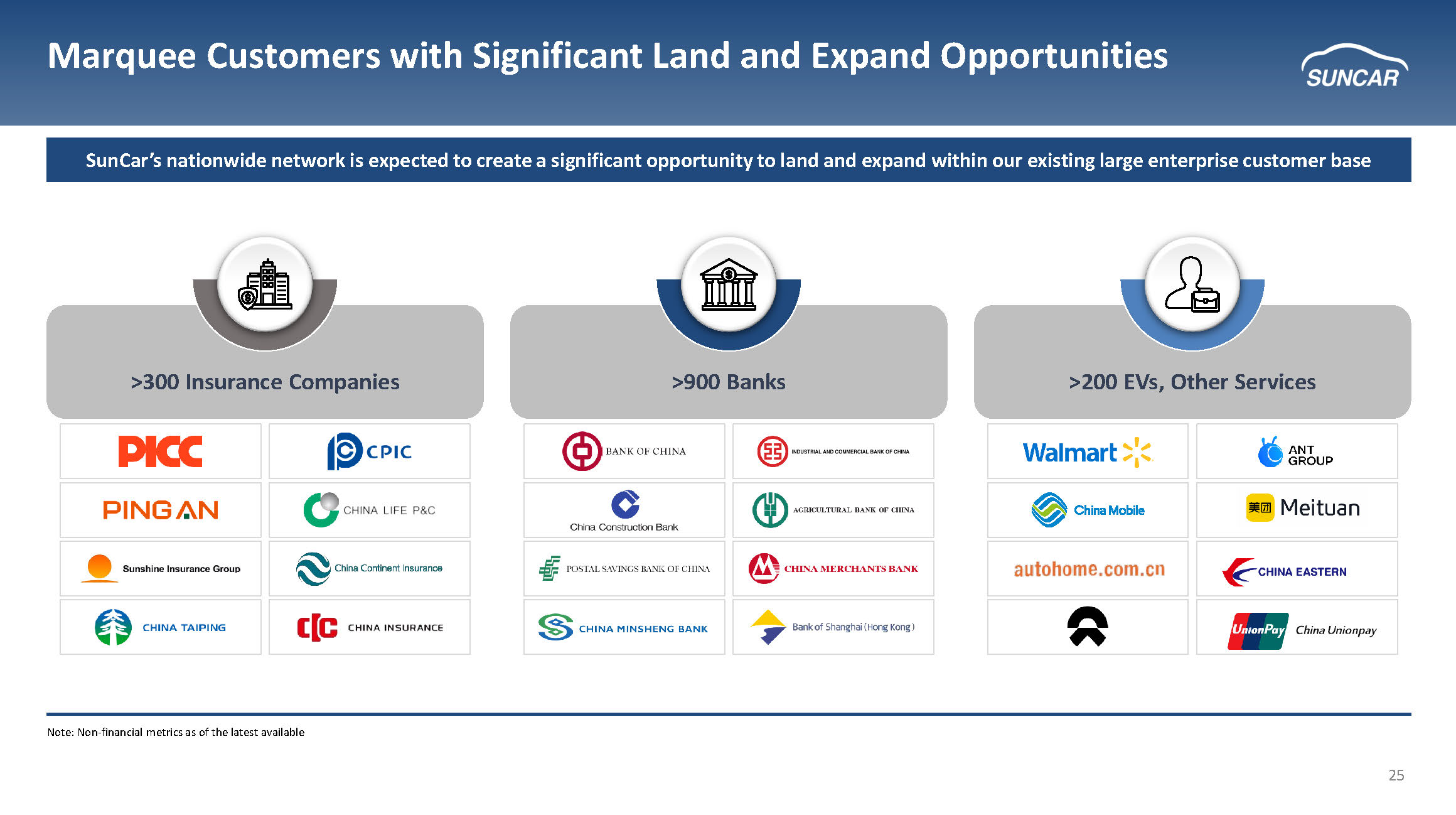 24 SunCar Auto Service Platform – Business Model Connecting to Over 48,000 Suppliers and Car Service Vendors 1,480+ Enterprise Clients Bank Bank Customer SunCar Auto Service Platform $ (Revenue) $ (COGS) Vendor 1 Vendor 2 Vendor 3 x Customizable menu x Nationwide coverage x 48,000 vendor options across country x Automated scheduling x Ease of use QR based payment (cashless or discounted) Bank Mobile App APP POWERED BY SUNCAR Car Service Credit Balance: $200 OPTIONS CAR WASH OIL CHANGE ROADSIDE SEARCH LOCATION TYPE PRICE REVIEW SELECT VENDOR 1 VENDOR 2 VENDOR 3 VENDOR 4 1 2 3 SCHEDULE 4 TIME ~22.5M Auto Service transactions (1) completed for enterprise customers Note: Non - financial metrics as of the latest available (1) Metrics as of fiscal year ending December 2024