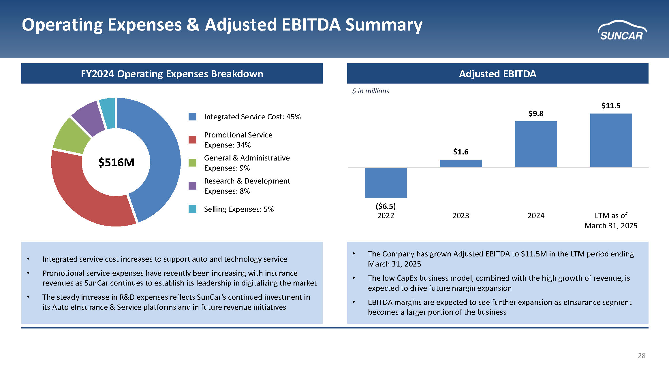 27 Revenue Summary Note: Revenue and revenue CAGR based on USD revenue for period of fiscal years 2022 to LTM as of March 31, 2025 Revenue Growth $ in millions LTM Revenue Breakdown $459M Technology Services: 10% Auto eInsurance Services: 40% Auto Services: 50% • Strong LTM performance in - line with historical growth in the business • Revenue growth fueled by the eInsurance segment and the rapid adoption of EVs in China, as well as SunCar’s growth in the gas vehicle market • Technology Service continues to stay strong with growth in line with the insurance platform • Auto eInsurance is a major growth driver for SunCar and is being driven by partnerships with industry leaders, auto renewals within existing base, and integrations across auto service and insurance • As the Auto eInsurance business continues to post rapid growth, SunCar’s revenue mix would be further diversified $199 $215 $226 $228 $68 $118 $171 $183 $15 $31 $45 $48 $282 $364 $442 $459 2022 2023 2024 LTM as of March 31, 2025 Technology Service Auto eInsurance Service Auto Service Segment CAGRs: 65% 56% 6%