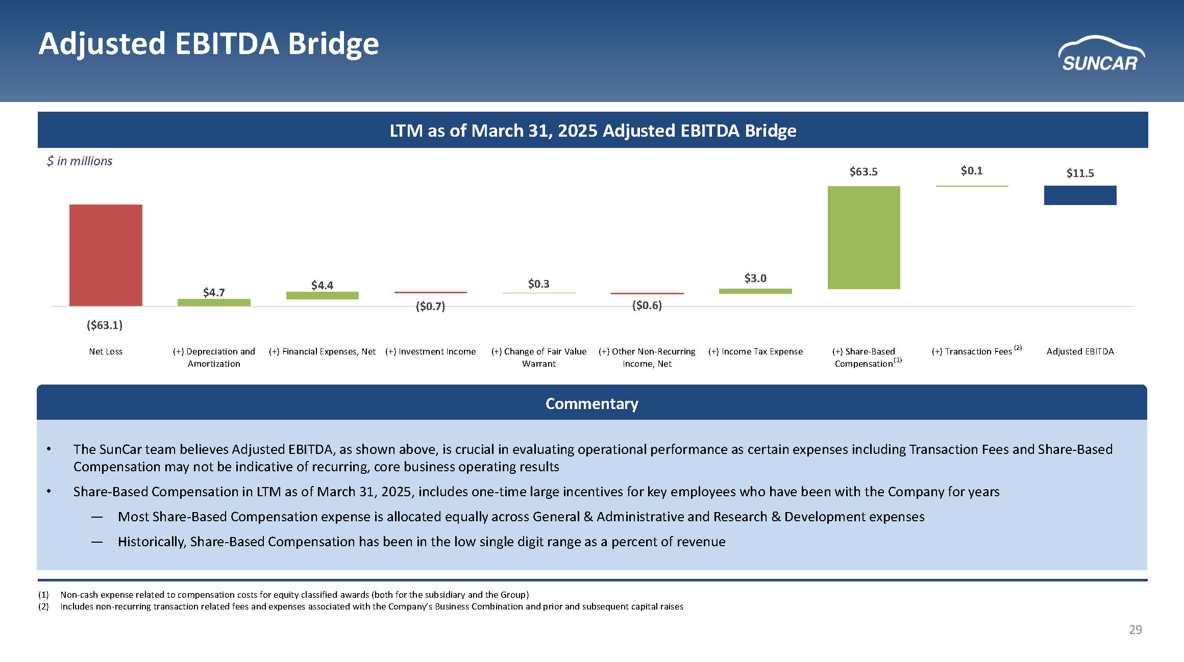 28 Operating Expenses & Adjusted EBITDA Summary FY2024 Operating Expenses Breakdown Adjusted EBITDA $ in millions • Integrated service cost increases to support auto and technology service • Promotional service expenses have recently been increasing with insurance revenues as SunCar continues to establish its leadership in digitalizing the market • The steady increase in R&D expenses reflects SunCar’s continued investment in its Auto eInsurance & Service platforms and in future revenue initiatives • The Company has grown Adjusted EBITDA to $11.5M in the LTM period ending March 31, 2025 • The low CapEx business model, combined with the high growth of revenue, is expected to drive future margin expansion • EBITDA margins are expected to see further expansion as eInsurance segment becomes a larger portion of the business Research & Development Expenses: 8% General & Administrative Expenses: 9% Integrated Service Cost: 45% Promotional Service Expense: 34% Selling Expenses: 5% $516M ($6.5) $1.6 $9.8 $11.5 2022 2023 2024 LTM as of March 31, 2025