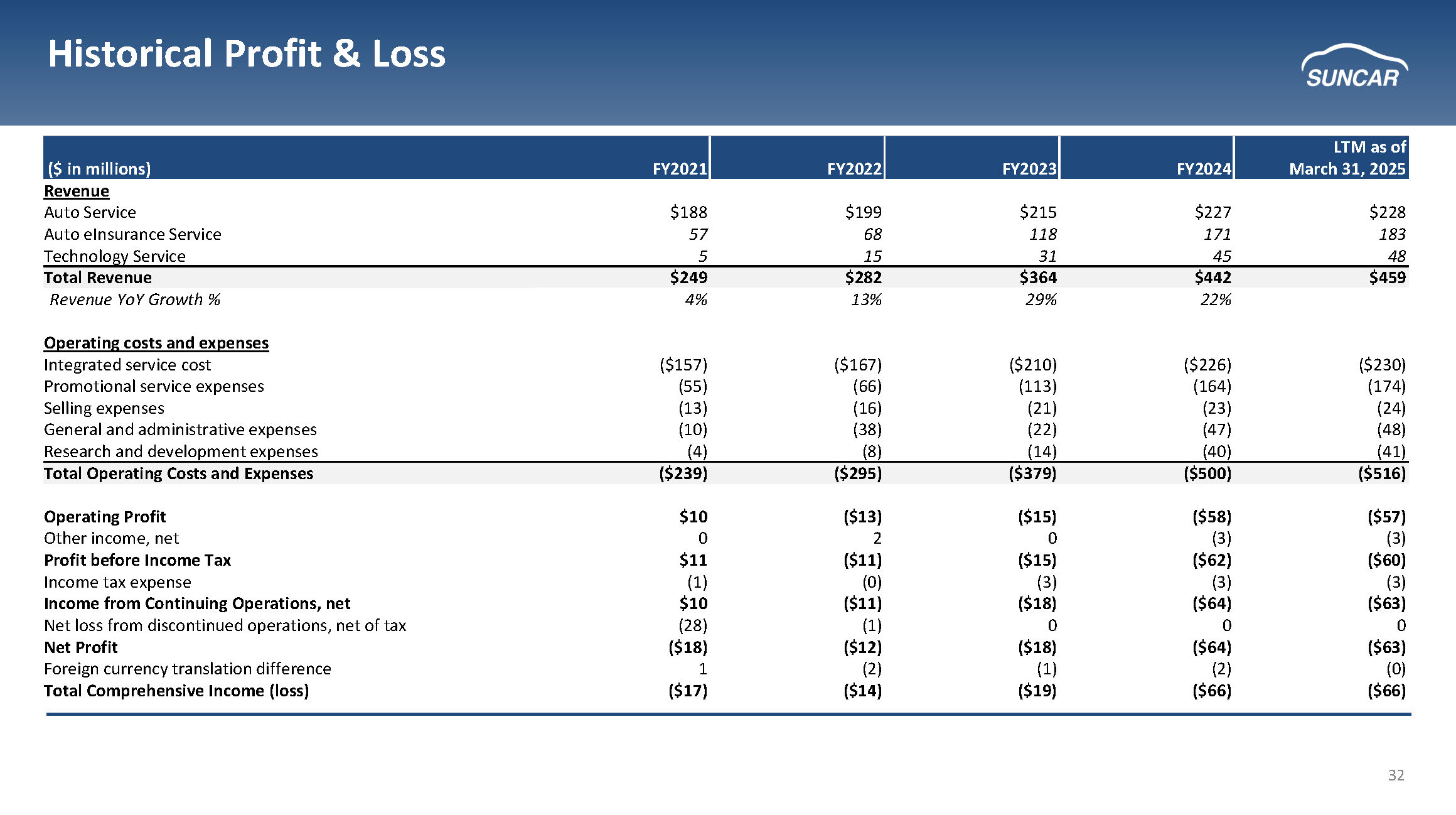 32 LTM as of March 31, 2025 FY2024 FY2023 FY2022 FY2021 ($ in millions) Revenue $228 $227 $215 $199 $188 Auto Service 183 171 118 68 57 Auto eInsurance Service 48 45 31 15 5 Technology Service $459 $442 $364 $282 $249 Total Revenue 22% 29% 13% 4% Revenue YoY Growth % Operating costs and expenses ($230) ($226) ($210) ($167) ($157) Integrated service cost (174) (164) (113) (66) (55) Promotional service expenses (24) (23) (21) (16) (13) Selling expenses (48) (47) (22) (38) (10) General and administrative expenses (41) (40) (14) (8) (4) Research and development expenses ($516) ($500) ($379) ($295) ($239) Total Operating Costs and Expenses ($57) ($58) ($15) ($13) $10 Operating Profit (3) (3) 0 2 0 Other income, net ($60) ($62) ($15) ($11) $11 Profit before Income Tax (3) (3) (3) (0) (1) Income tax expense ($63) ($64) ($18) ($11) $10 Income from Continuing Operations, net 0 0 0 (1) (28) Net loss from discontinued operations, net of tax ($63) ($64) ($18) ($12) ($18) Net Profit (0) (2) (1) (2) 1 Foreign currency translation difference ($66) ($66) ($19) ($14) ($17) Total Comprehensive Income (loss) Historical Profit & Loss