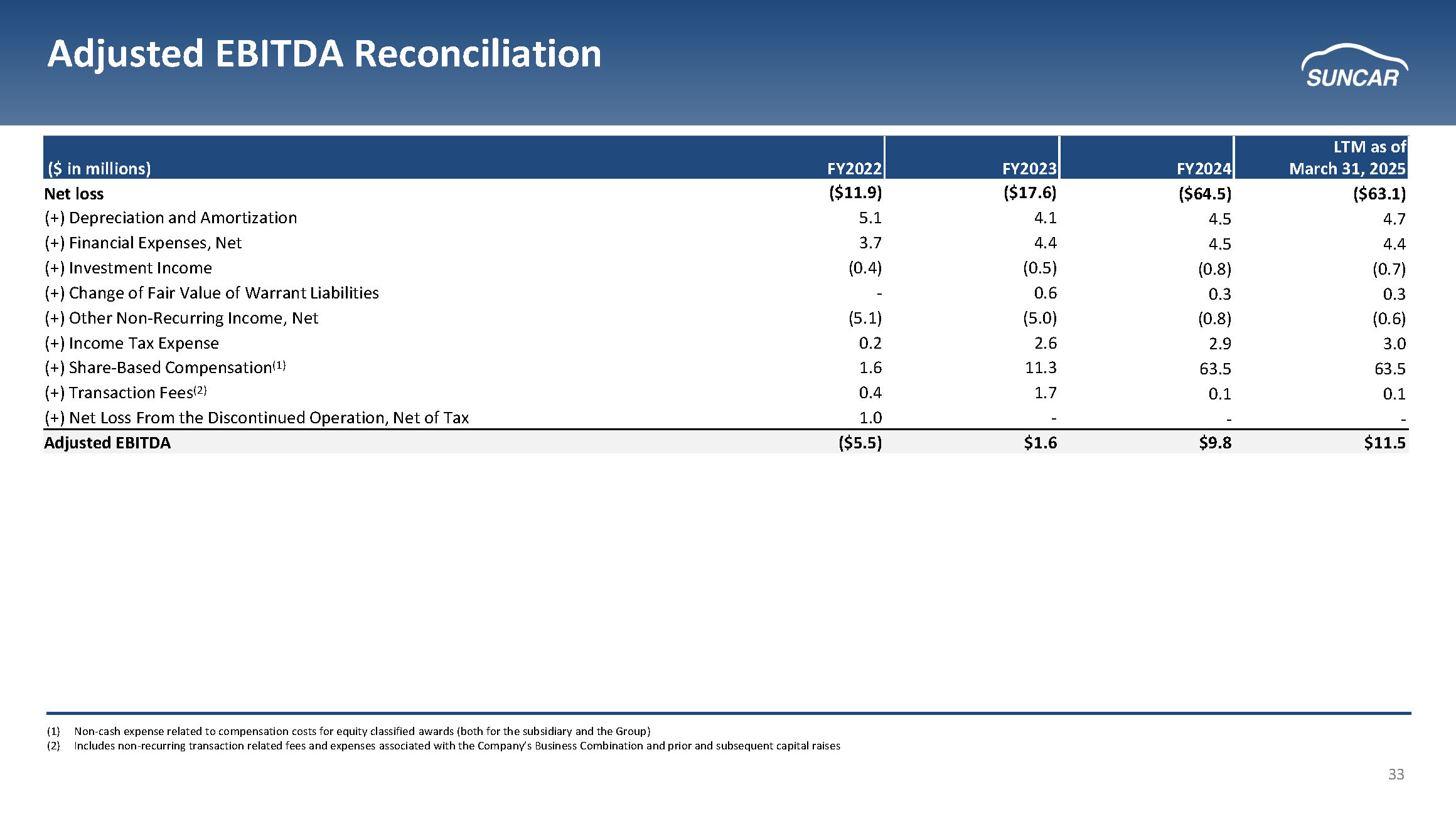 29 Adjusted EBITDA Bridge Commentary (1) Non - cash expense related to compensation costs for equity classified awards (both for the subsidiary and the Group) (2) Includes non - recurring transaction related fees and expenses associated with the Company’s Business Combination and prior and su bsequent capital raises LTM as of March 31, 2025 Adjusted EBITDA Bridge $ in millions • The SunCar team believes Adjusted EBITDA, as shown above, is crucial in evaluating operational performance as certain expense s i ncluding Transaction Fees and Share - Based Compensation may not be indicative of recurring, core business operating results • Share - Based Compensation in LTM as of March 31, 2025, includes one - time large incentives for key employees who have been with th e Company for years ― Most Share - Based Compensation expense is allocated equally across General & Administrative and Research & Development expenses ― Historically, Share - Based Compensation has been in the low single digit range as a percent of revenue ($63.1) $4.7 $4.4 ($0.7) $0.3 ($0.6) $3.0 $63.5 $0.1 $11.5 Net Loss (+) Depreciation and Amortization (+) Financial Expenses, Net (+) Investment Income (+) Change of Fair Value Warrant (+) Other Non-Recurring Income, Net (+) Income Tax Expense (+) Share-Based Compensation (+) Transaction Fees Adjusted EBITDA (1) (2)